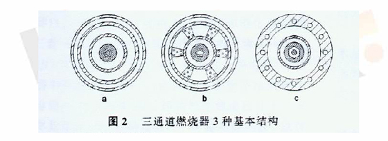 從上述分析中可知,增加一次射流的旋流數將提高一次射流的引射速率,即煤粉和二次風的混合速率,從而強化了窯頭煤粉燃燒,使火焰變得粗短,所以旋流系數又被稱之為火焰形狀系數。實際上燃燒器噴嘴結構形式和參數的變化也明顯地影響火焰的形狀。從空氣動力學的角度簡單地理解,一次射流對二次風的引射量取決于一次射流的動量通量,其引射速率除受一次射流角動量通量控制外,一次射流和二次風的接觸面積(以水力半徑度量)顯然對引射速率有較大影響,因為引射是通過射流股和周邊二次風接觸而上的動量交換而產生的。噴嘴設計中,在保持噴嘴出口截面積不變情況下減小水力半徑,即增加射流股和二次風的接觸面積,將增加煤粉和二次風的混合速率,使火焰變得粗短;另一方面也由于過高的二次風混入速率使一次射流股的核心速度衰減過快,表現為火焰“剛度”下降,對窯內的穿透深度減小。筆者曾就當時市面上的三通道煤粉燃燒器歸納成3種基本結構形式,見圖2。其中在相同的一次凈風總的出口截面積情況下,c型對二次風的引射速率高于a型,實踐中前者火焰粗短,燃燒劇烈,較適合于強化煅燒情況。b型中煤粉通道被分割成數個流股,由于煤粉通道介于內風和外風通道之間,因而增加了煤粉對一次風的混合能力。筆者認為,這種結構形式可能對燃燒速率影響不大,實踐中我國在300t/d、600t/d的預熱器窯上使用較多,普遍認為火焰散,有時甚至出現所謂的“鷹爪型”火焰,這種不利現象可以通過適當減小煤粉通道的動量通量得以改善。